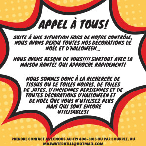 La Maison des jeunes de Waterville lance un appel à tous pour l’aider à rendre possible sa traditionnelle maison hantée pour l’Halloween. Suite à une situation hors de leur contrôle, la MDJ Les Pacifistes ont besoin de vous pour amasser tissus ou toiles noires, de toiles de jutes, d’anciennes persiennes, de toute décoration d’Halloween ou encore de Noël que vous n’utilisez plus et qui sont encore utilisables.