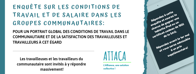 L’ATTACCA demande aux travailleuses et travailleurs du communautaire à répondre massivement à une enquête sur les conditions de travail et l’appréciation qu’elles et ils en ont, afin de dresser un portrait plus exact de la réalité du terrain. Les réponses se font sur une base individuelle, et non par organisme.