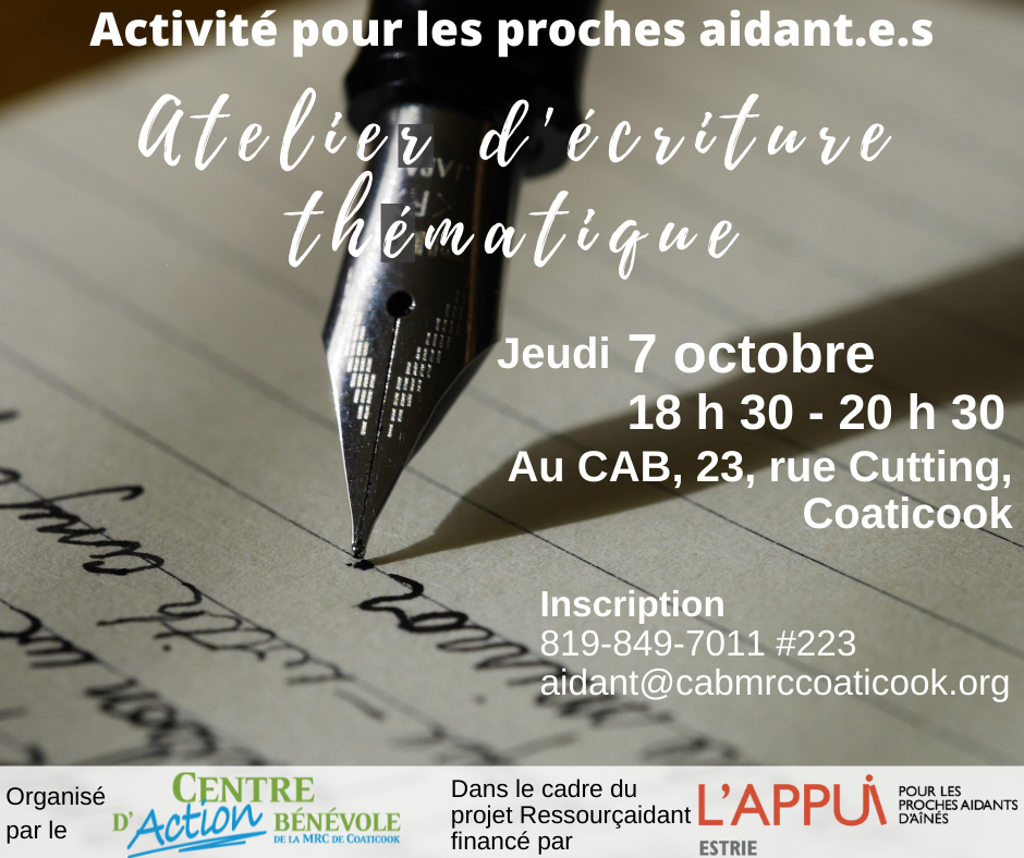 Nous invitons les personnes proches aidantes à participer à un atelier d’écriture thématique animé par le nouvel agent de soutien aux proches aidant.e.s du Centre d’action bénévole, Marc-Étienne Messier.