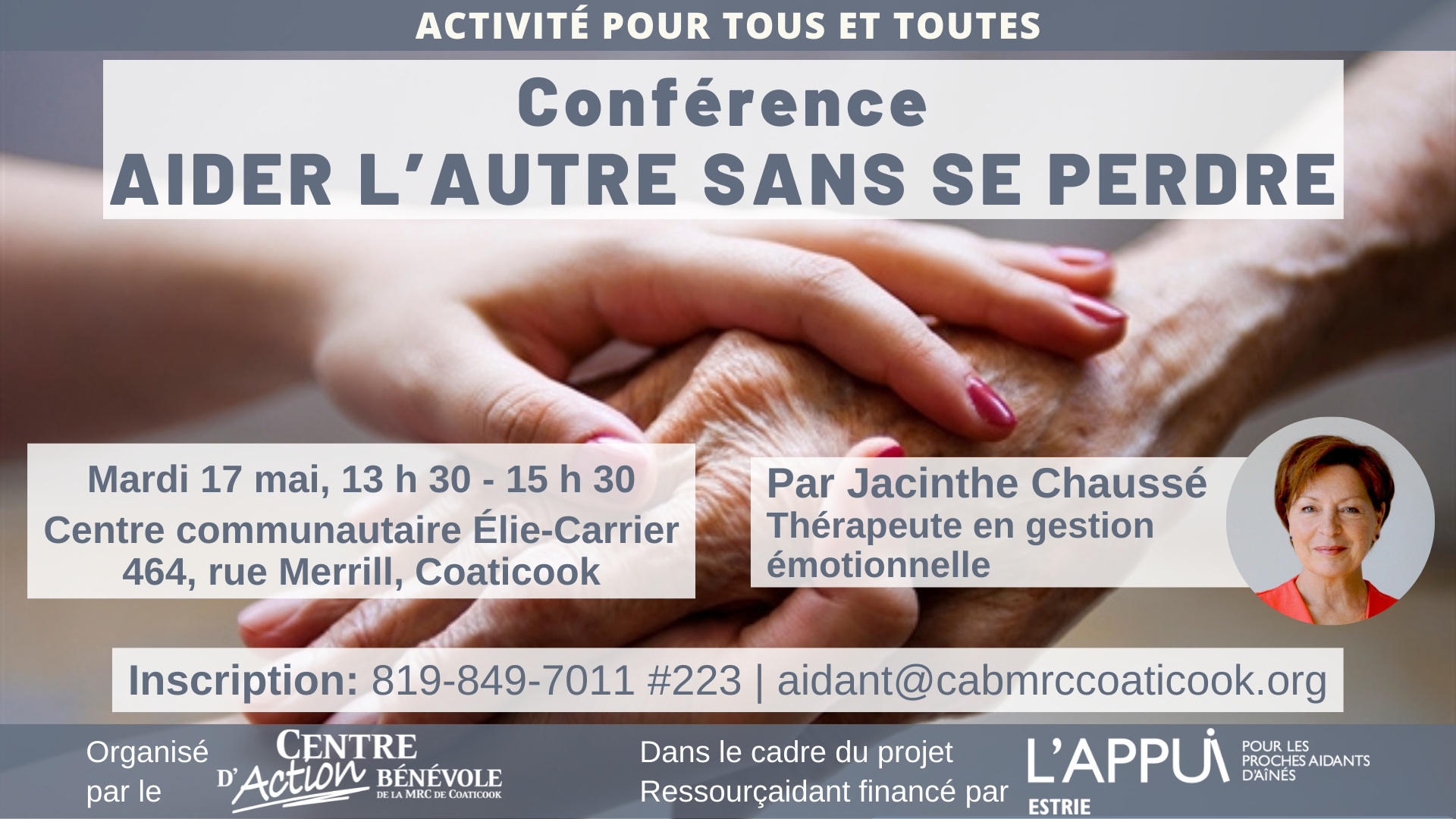 Inscription obligatoire : 819-849-7011, poste 223, ou aidant@cabmrccoaticook.org