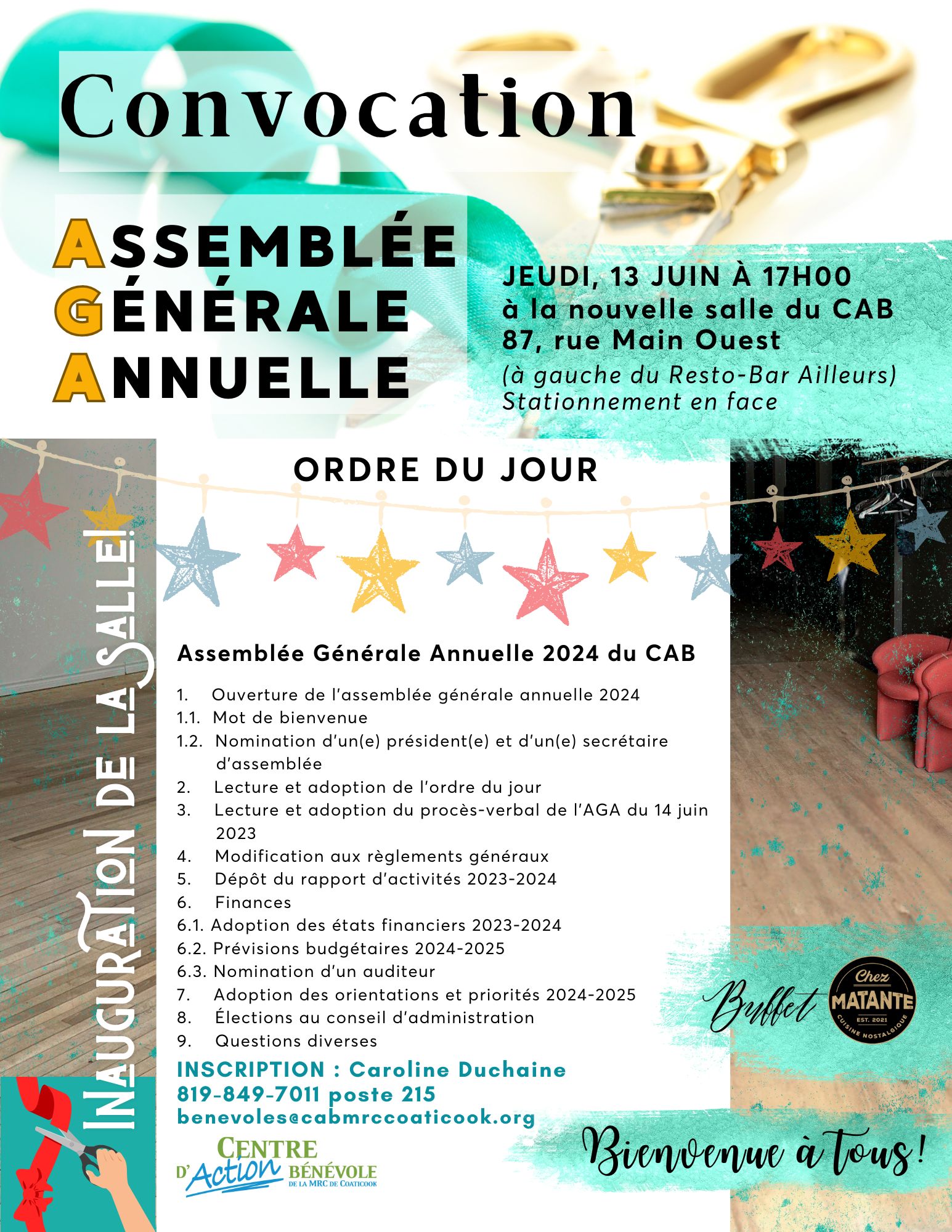 Le Centre d’action bénévole de la MRC de Coaticook vous invite à son Assemblée générale annuelle qui aura lieu le jeudi 13 juin de 17h à 20h. C’est l’occasion parfaite pour découvrir les résultats de l’année, pour participer à l’inauguration de notre nouveau local, pour rencontrer d’autres bénévoles et pour déguster un excellent buffet!