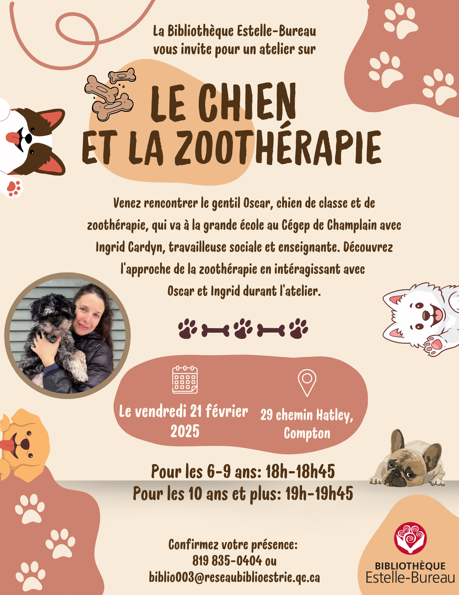 Venez rencontrer le petit Oscar, chien de classe et de zoothérapie, qui va à la grande école au Cégep de Champlain avec Ingrid Cardyn, travailleuse sociale et enseignante. Découvrez l’approche de la zoothérapie en interagissant avec Oscar et Ingrid durant l’atelier.