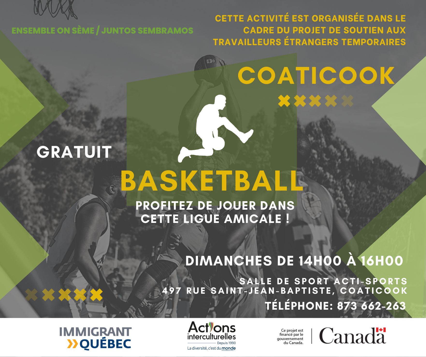 Des après-midis de basketball auront lieu à Acti-Sports tous les dimanches jusqu’au 26 mai 2024. Cette activité est organisée dans le cadre du projet de soutien aux travailleurs étrangers temporaires.