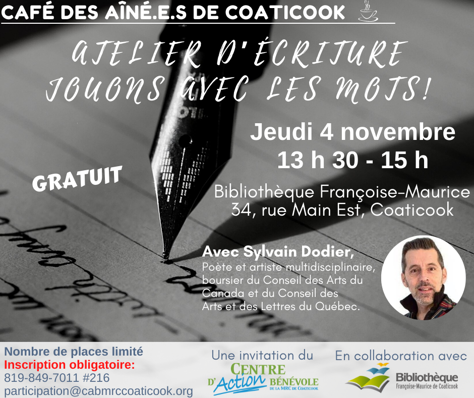 Un atelier d’écriture animé par Sylvain Dodier, poète et artiste multidisciplinaire, boursier du Conseil des Arts du Canada et du Conseil des Arts et des Lettres du Québec.