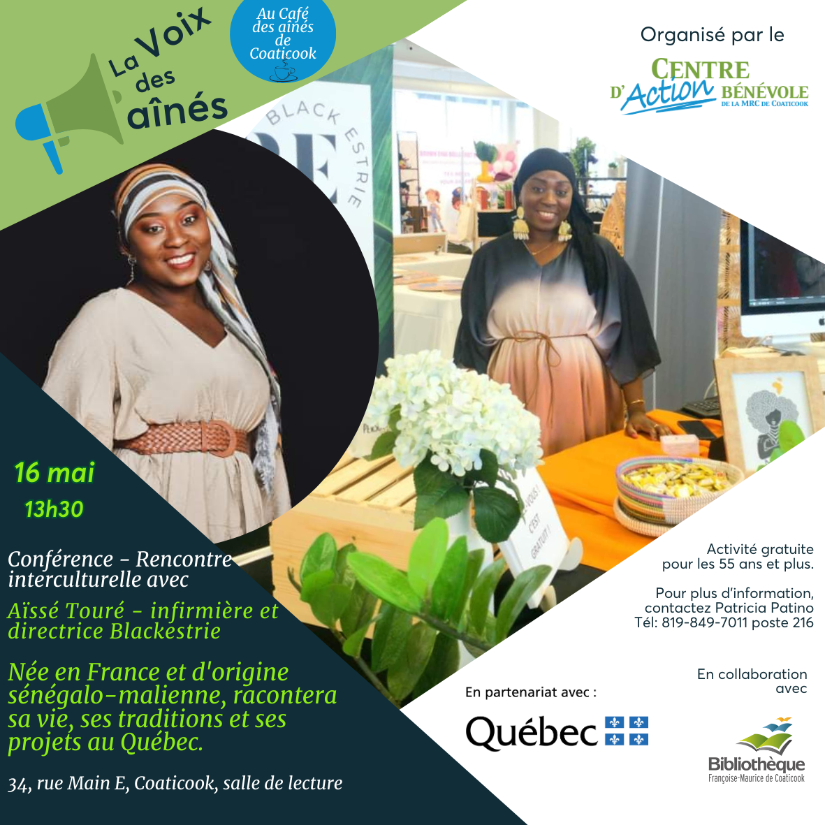 Sans bouger de notre chaise, nous ferons un voyage de la France à l’Afrique jusqu’au Québec avec Aïssé Touré, infirmière clinicienne au Québec depuis 2014 et Fondatrice Directrice générale de l’organisme BlackEstrie. Ce sera un voyage riche en diversité culturelle et en partage de traditions! Il s’agit d’une activité organisée par le Centre d’action bénévole de la MRC de Coaticook.