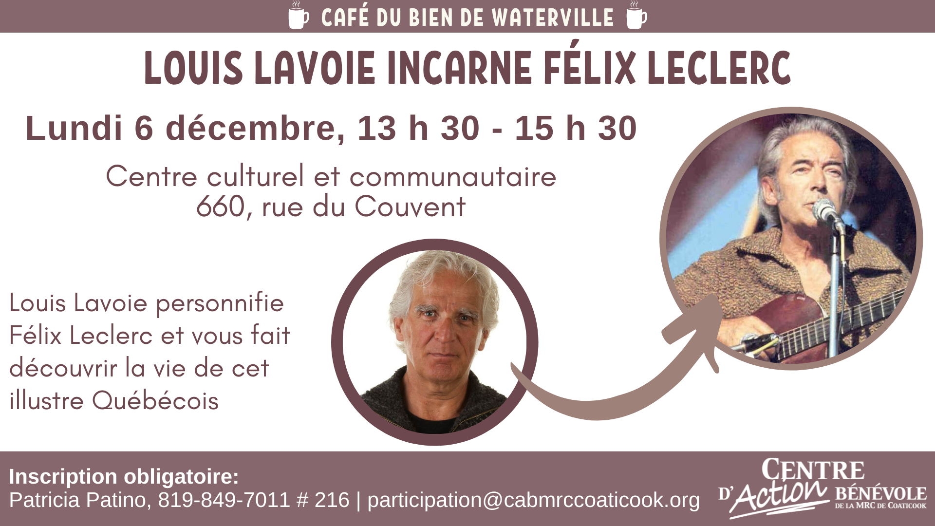 Lors de ce Café du bien, Louis Lavoie personnifiera Félix Leclerc et vous fera découvrir la vie de cet illustre Québécois.