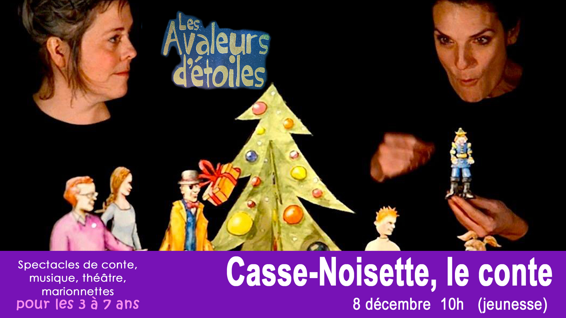 Le soir du réveillon de Noël, Marie remarque un drôle de petit bonhomme en bois, resté accroché à une branche du sapin. C’est un casse-noisette. Parrain Drosselmeyer affirme qu’il est bien laid, mais Marie l’adopte immédiatement. Au-delà des apparences, Marie et Casse-Noisette découvriront leur vraie nature et, surtout, la force de leur amitié à travers de grandes aventures. En scène, deux conteuses ouvrent les pages de leur grand livre, d’où sortiront tous les personnages, et s’adressent aux petits et aux grands.