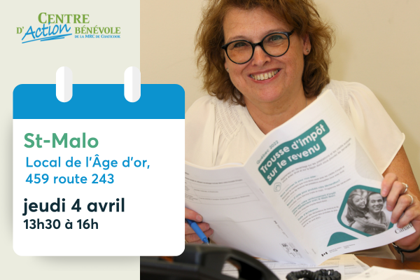 Les cliniques d’impôts gratuites du Centre d’action bénévole de la MRC de Coaticook auront lieu du 21 février au 24 avril. Elles se dérouleront à Coaticook, mais aussi dans les municipalités de la MRC. À St-Malo, une clinique aura lieu le 4 avril à 13h30 au local de l’Âge d’or (459 route 253). Pour de l’information ou pour prendre un rendez-vous : 819-849-7011 poste 231.