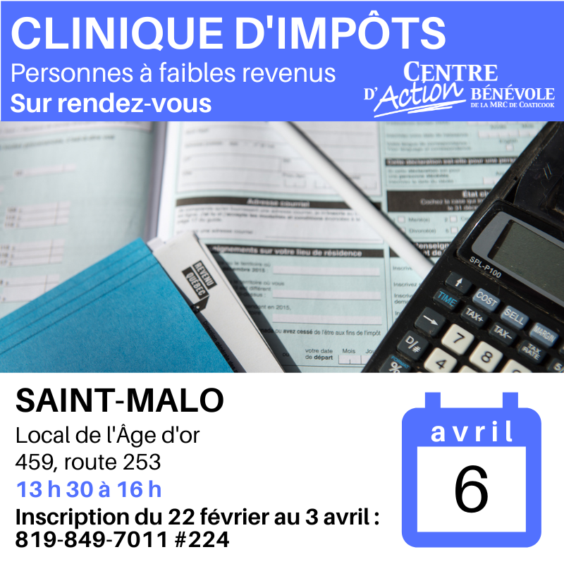 Inscription et prise de rendez-vous obligatoire par téléphone jusqu’au 3 avril : 819-849-7011, poste 224.