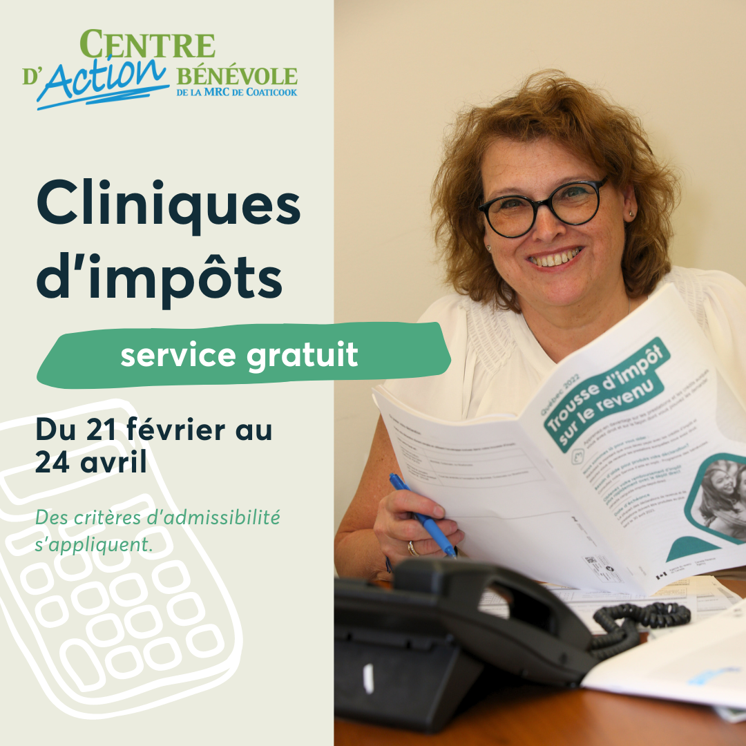 Les cliniques d’impôts gratuites du Centre d’action bénévole de la MRC de Coaticook auront lieu tous les mercredis du 21 février au 24 avril, de 13 h à 16 h au 87 rue Main à Coaticook (ancienne salle des Chevaliers de Colomb). Pour de l’information ou pour prendre un rendez-vous : 819-849-7011 poste 231.