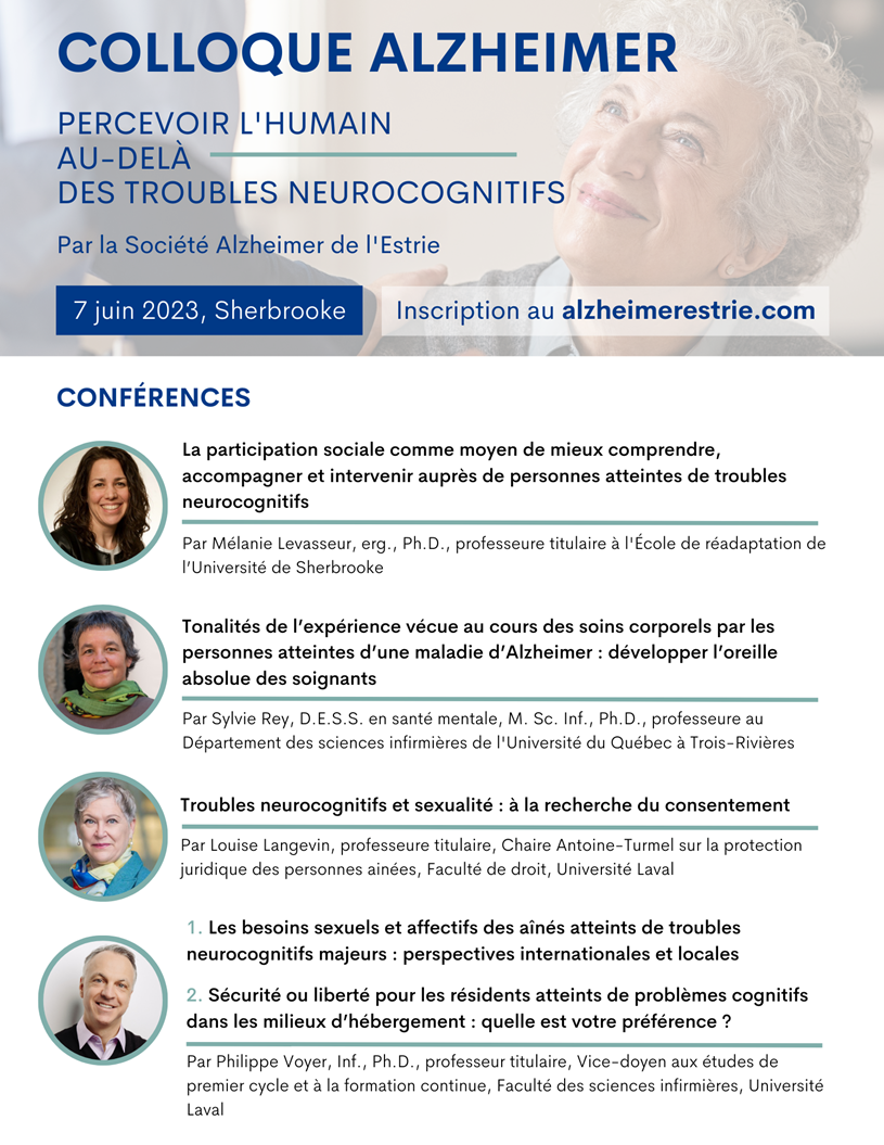 La Société Alzheimer de l’Estrie vous convie à son colloque le 7 juin prochain sous le thème : Percevoir l’humain au-delà des troubles neurocognitifs. Au menu : 5 conférences distinctes ainsi qu’un diner.