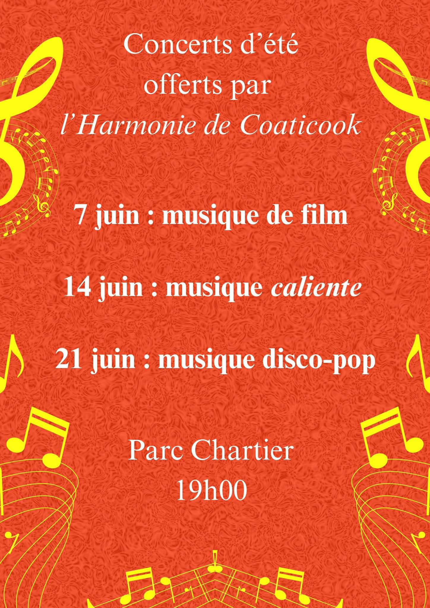 L’Harmonie de Coaticook vous invite à ses concerts d’été au parc Chartier du centre-ville de Coaticook les vendredis 7, 14 et 21 juin prochains dès 19h. Voici les thèmes :