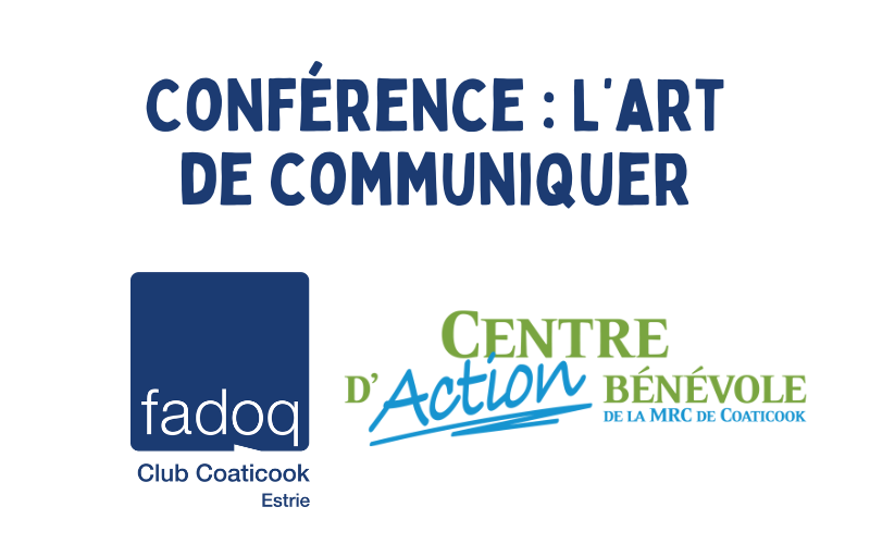 La Fadoq Coaticook en partenariat avec le Centre d’action bénévole de la MRC de Coaticook vous invite à la conférence : l’art de communiquer le 15 mai à 13h30 au centre communautaire Élie-Carrier de Coaticook. Le tout sera animé par Marc-Étienne Messier, agent de développement en service de soutien aux proches aidants.