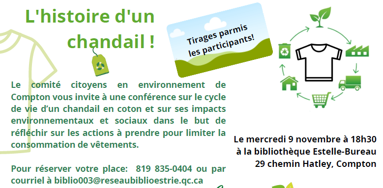 Le comité citoyens en environnement de Compton vous invite à une conférence ce mercredi 9 novembre à 18 h 30 sur le cycle de vie d’un chandail en coton et sur ses impacts environnementaux et sociaux dans le but de réfléchir sur les actions à prendre pour limiter la consommation de vêtements.