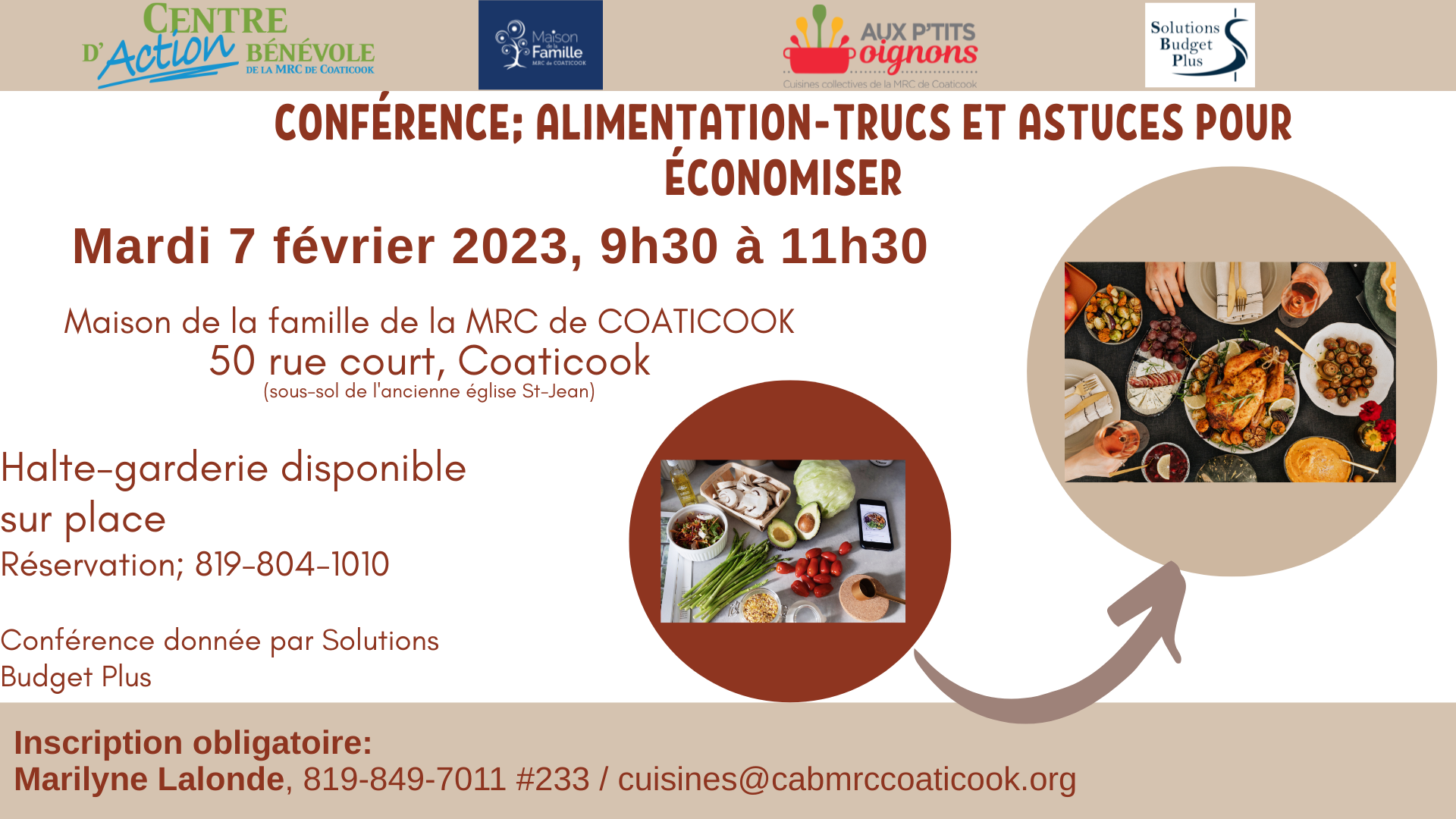 En collaboration avec Maison de la Famille MRC de Coaticook, le CAB est fier d’offrir gratuitement la conférence : Alimentation – trucs et astuces pour économiser présentée par Solutions Budget Plus ! Elle aura lieu le mardi 7 février dès 9 h 30 dans les locaux de la Maison de la famille (50 rue Court à Coaticook).