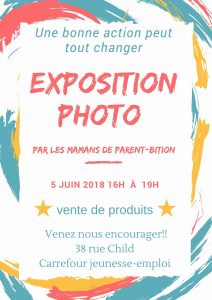 Les mamans de Parent-bition vous invite à leur exposition photo avec sur place, une petite collation gratuite. Vous pourrez également vous procurer des boules de bain effervescentes, des cadres de bois à clou et de la limonade fraîche que les mamans ont fait dans le but d’amasser des fonds pour une cause qui les touche particulièrement. Les fonds amassés et les dons supplémentaires seront envoyés aux familles de Syrie victimes de la guerre. Les mamans ont travaillé longuement à préparer des produits de qualités et monter l’exposition et elles ont hâte de vous présenter ce dur labeur.