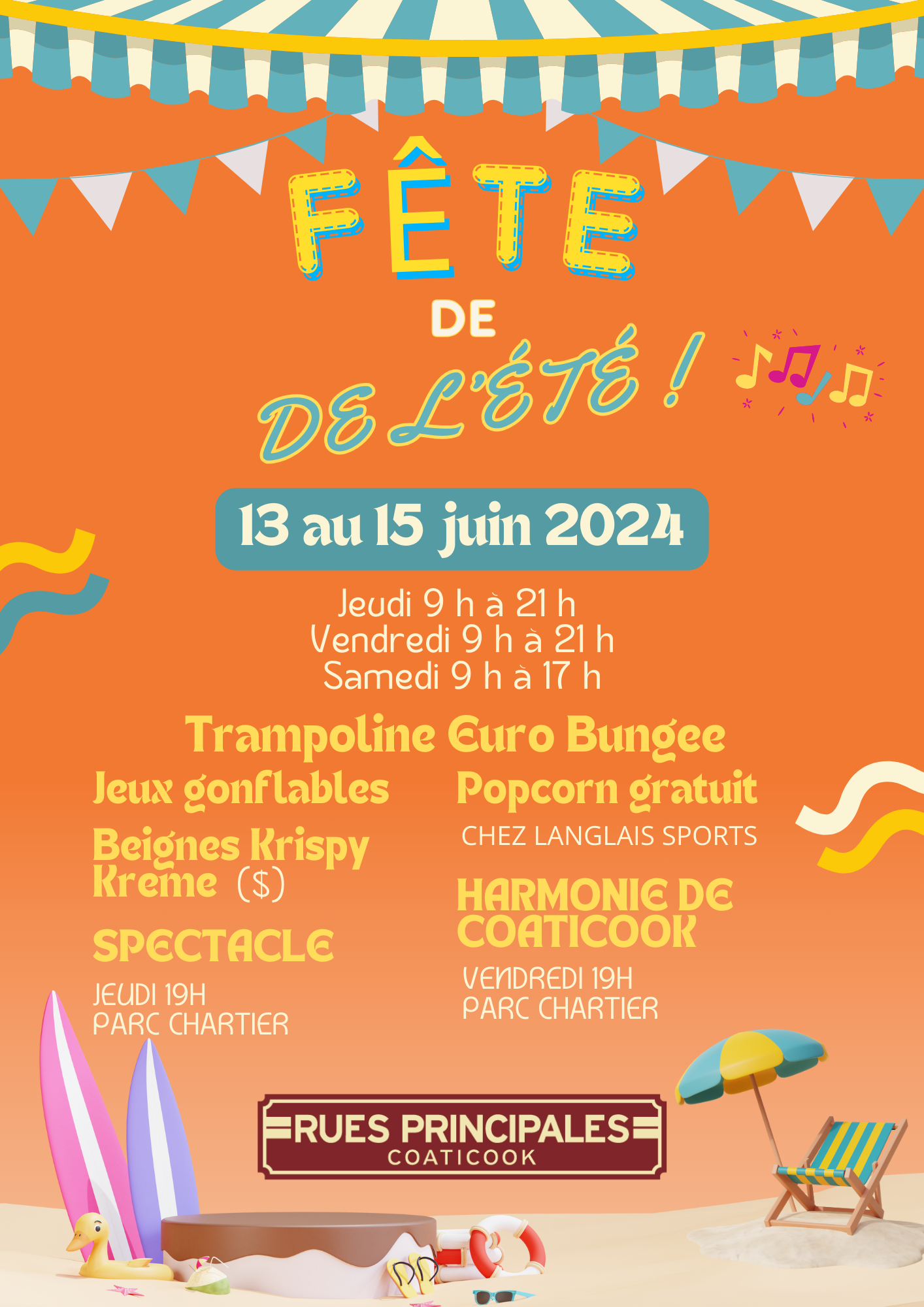 Du 13 au 15 juin, Rues Principales invite toute la population à des journées festive au centre-ville de Coaticook avec de l’animation, des jeux gonflables et des promotions chez les commerces participants. Voici ce qui est prévu :