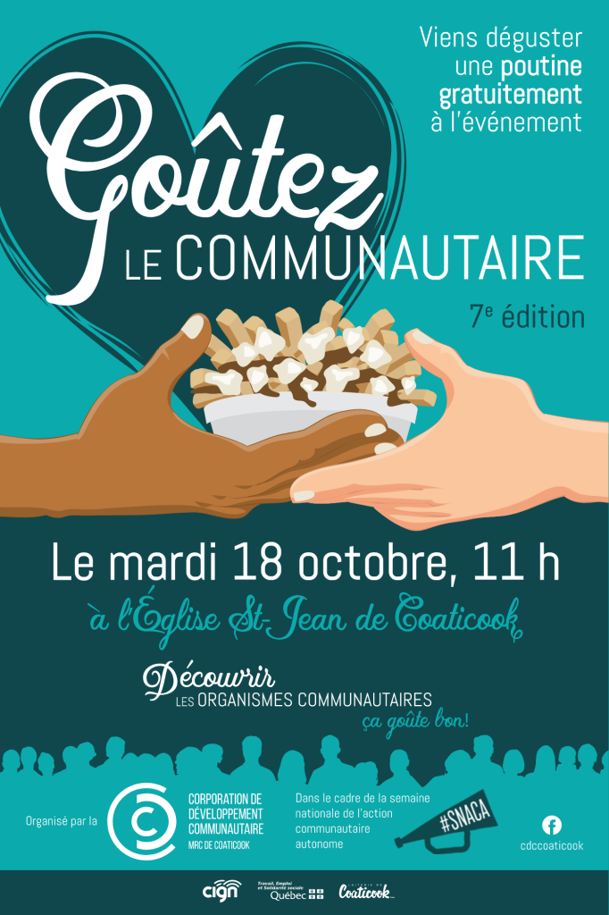 C’est le mardi 18 octobre 2022 qu’aura lieu la 7e édition de Goûtez le communautaire. L’événement qui vise à mettre en valeur les organismes communautaires de la région revient après deux ans d’absence à Coaticook, faute de la pandémie. La journée sera soulignée de 11h à 14h dans l’Église St-Jean à Coaticook. Et oui, on change de lieu pour nous permettre d’avoir plus d’espace, ce qui permettra d’accueillir plus de gens ! Toutes les personnes sur place recevront une poutine gratuite préparée par le restaurant Chez Matante de Ste-Edwidge, parce qu’on aime encourager local.