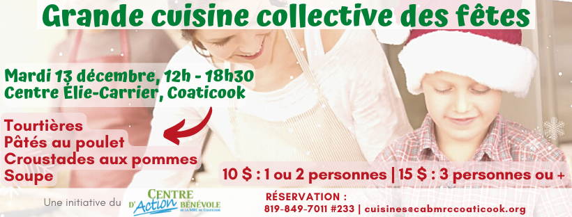 Notre traditionnelle Grande cuisine collective des fêtes sera de retour pour une 13e édition le mardi 13 décembre en après-midi et en soirée au Centre communautaire Elie-Carrier de Coaticook.