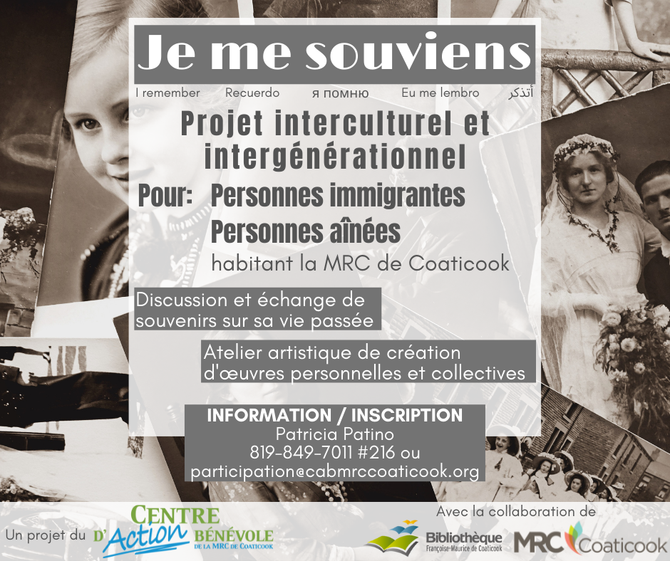 Le Centre d’action bénévole invite les personnes immigrantes et les personnes aînées habitant la MRC de Coaticook à participer au projet Je me souviens.