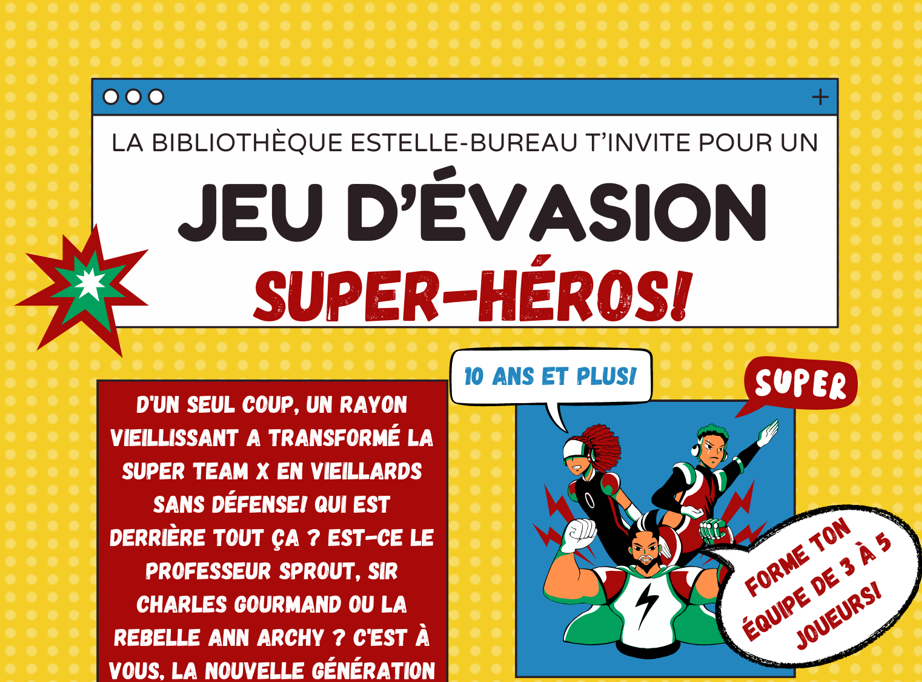 Jeu d’évasion destiné aux 10 ans et plus. Forme ton équipe de 3 à 5 joueurs et tente de résoudre toutes les énigmes en moins d’une heure! Choisis entre le départ de 18h ou le départ de 19h. Ton inscription est requise auprès de Jordane Masson au 819-835-0404.