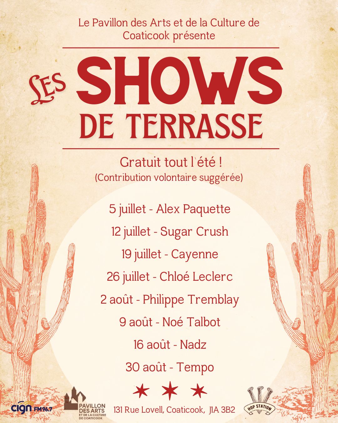 Tous les samedis d’été, le Pavillon des arts et de la culture de Coaticook présente les Shows de terrasse à la microbrasserie Hop Station.