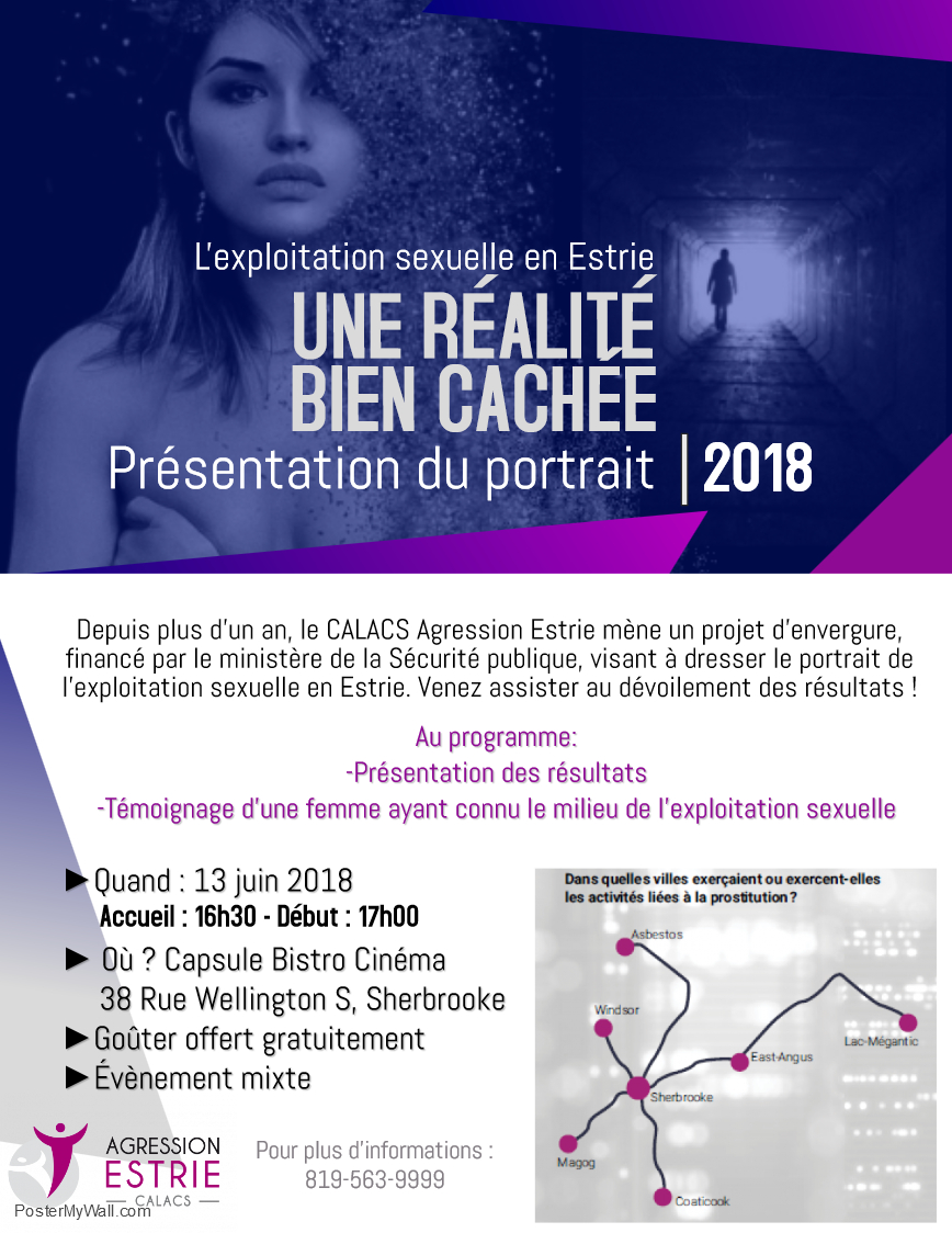 Depuis plus d’un an, le CALACS Agression Estrie mène un projet d’envergure, financé par le ministère de la Sécurité publique, visant à dresser le portrait de l’exploitation sexuelle en Estrie.