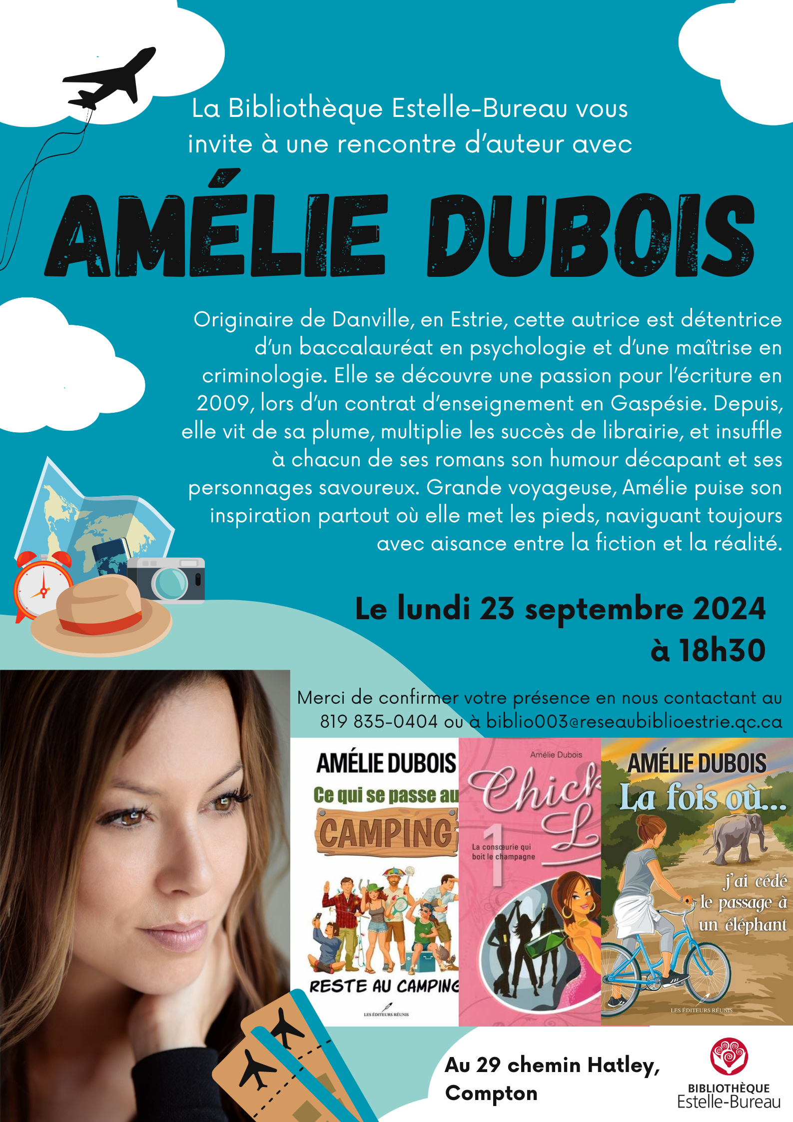 Originaire de Danville en Estrie, l’autrice Amélie Dubois est détentrice d’un baccalauréat en psychologie et d’une maîtrise en criminologie. Elle se découvre une passion pour l’écriture en 2009, lors d’un contrat d’enseignement en Gaspésie. Depuis, elle vit de sa plume et multiplie les succès en librairie avec ses séries bien connues comme « Chick lit », « Là fois où… », « Ce qui se passe au congrès reste au congrès », etc. Elle insuffle à chacun de ses romans son humour décapant et ses personnages savoureux. Grande voyageuse, Amélie puise son inspiration partout où elle met les pieds, naviguant toujours avec aisance entre la fiction et la réalité.