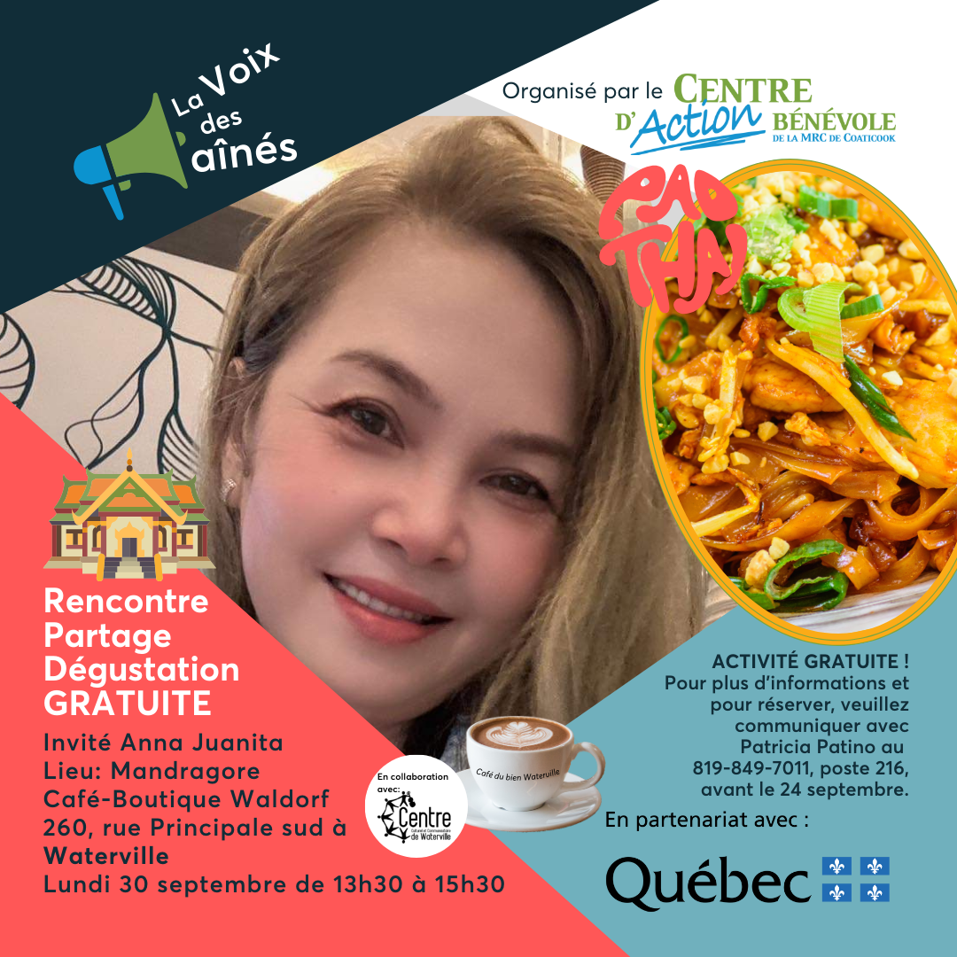 Le lundi 30 septembre de 13h30 à 15h30, rejoignez-nous au Mandragore, boutique Waldorf, pour un atelier culinaire exceptionnel. Anna Juanita, une habitante de la MRC de Coaticook originaire de la Thaïlande, nous fera voyager à travers les saveurs exotiques de son pays en préparant un délicieux Pad Thai traditionnel.