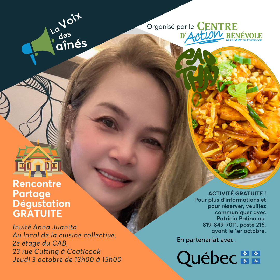 Le jeudi 3 octobre de 13h à 15h, rejoignez-nous au Centre d’action bénévole (23 rue Cutting) pour un atelier culinaire exceptionnel. Anna Juanita, une habitante de la MRC de Coaticook originaire de la Thaïlande, nous fera voyager à travers les saveurs exotiques de son pays en préparant un délicieux Pad Thai traditionnel.
