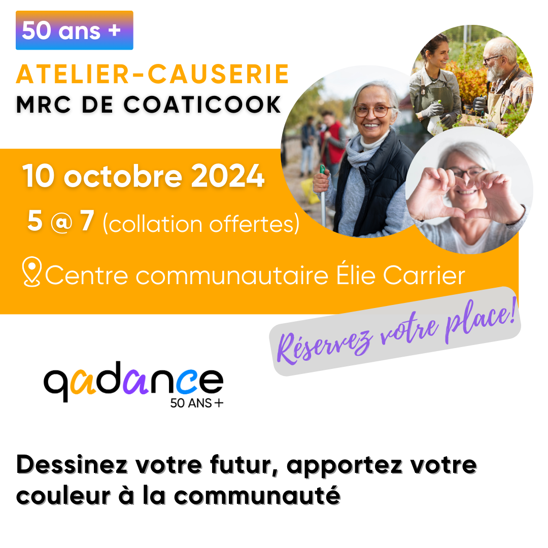 C’est quoi QADAnce 50 ans+? C‘est une série d’ateliers inspirants et d’espaces de réflexion conçus pour les personnes de 50 ans et plus en quête d’un second projet de vie ou en quête de sens en vue de la pré-retraite. Ces rencontres, d’une durée de 90 minutes, vous invitent à explorer comment vos compétences et vos intérêts peuvent faire une différence dans votre communauté. Le tout premier atelier aura lieu le 10 octobre 2024 à 17h au Centre communautaire de Coaticook. Il vous propose :