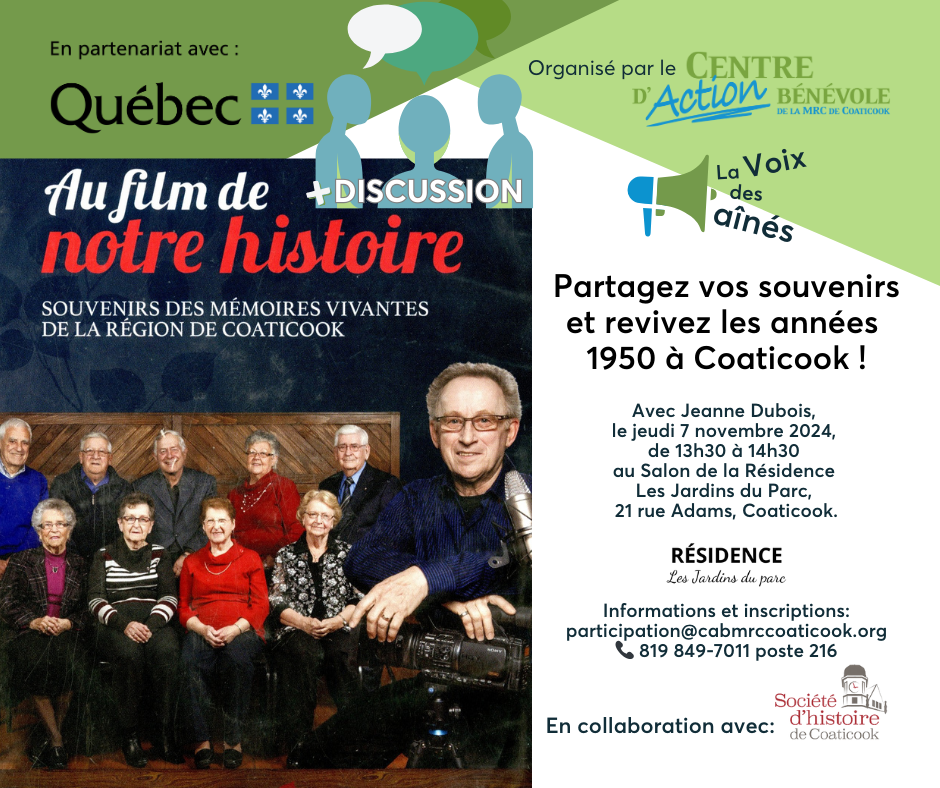 Partagez vos souvenirs et revivez les années 1950 à Coaticook ! Avec Jeanne Dubois, le jeudi 7 novembre 2024, de 13h30 à 14h30 au Salon de la Résidence « Les Jardins du Parc » à Coaticook.