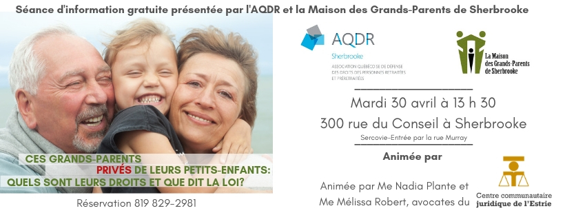 L’AQDR Sherbrooke et la Maison des Grands-Parents de Sherbrooke offrent cette séance d’information en collaboration avec le Centre communautaire juridique de l’Estrie pour répondre aux questions des grands-parents sur leurs droits vis-à-vis de leurs petits-enfants.