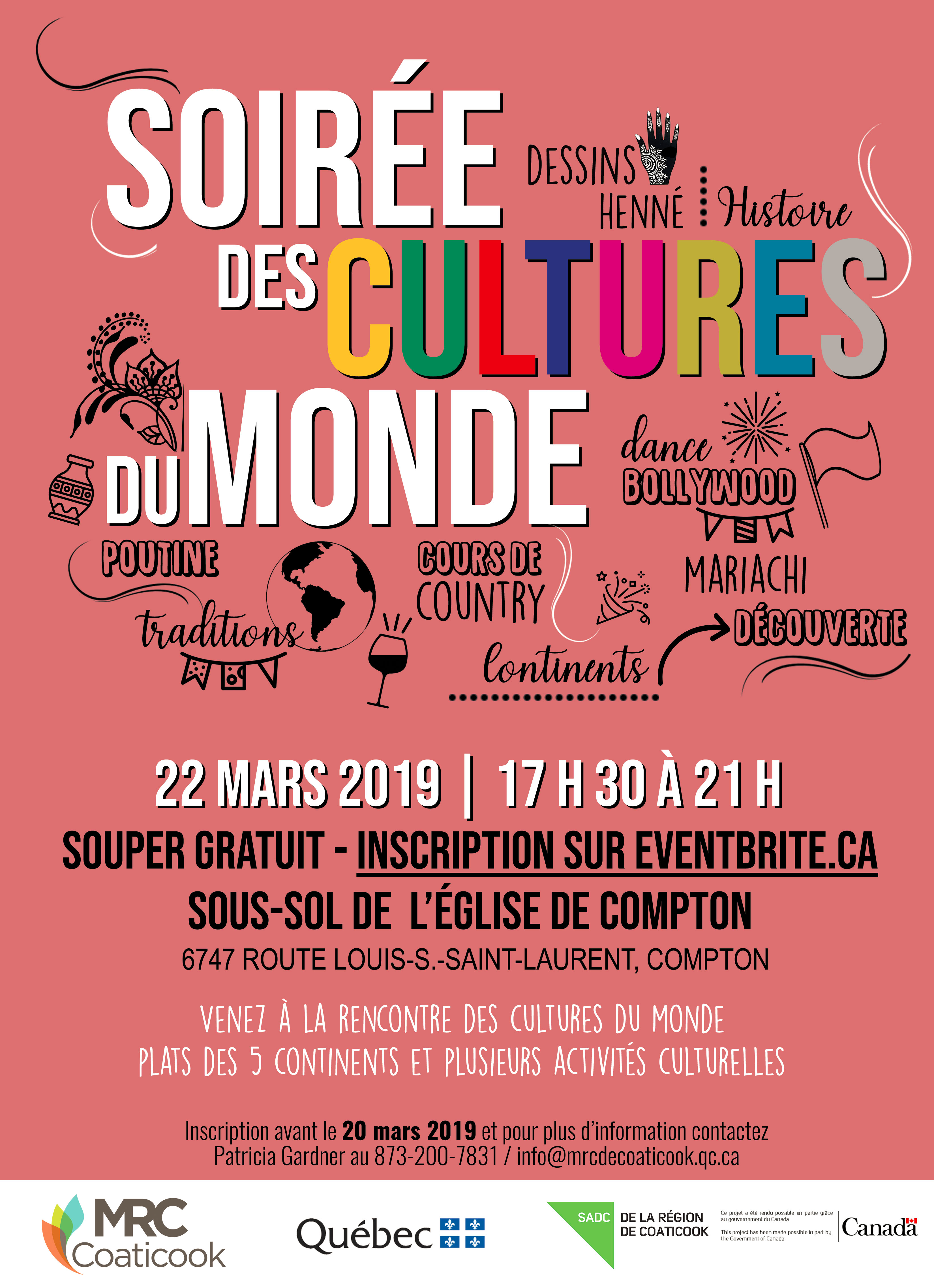 La MRC de Coaticook vous invite à découvrir les cultures du monde lors d’un souper gratuit! Des plats de plusieurs continents vous seront offerts, en plus de différentes activités culturelles. Cours et démonstration de danse Bollywood et Country, dessins Henné, jeux pour les enfants, exposition photo et plus encore! Inscrivez-vous avant le 20 mars prochain. Faites vite, les places sont limitées.