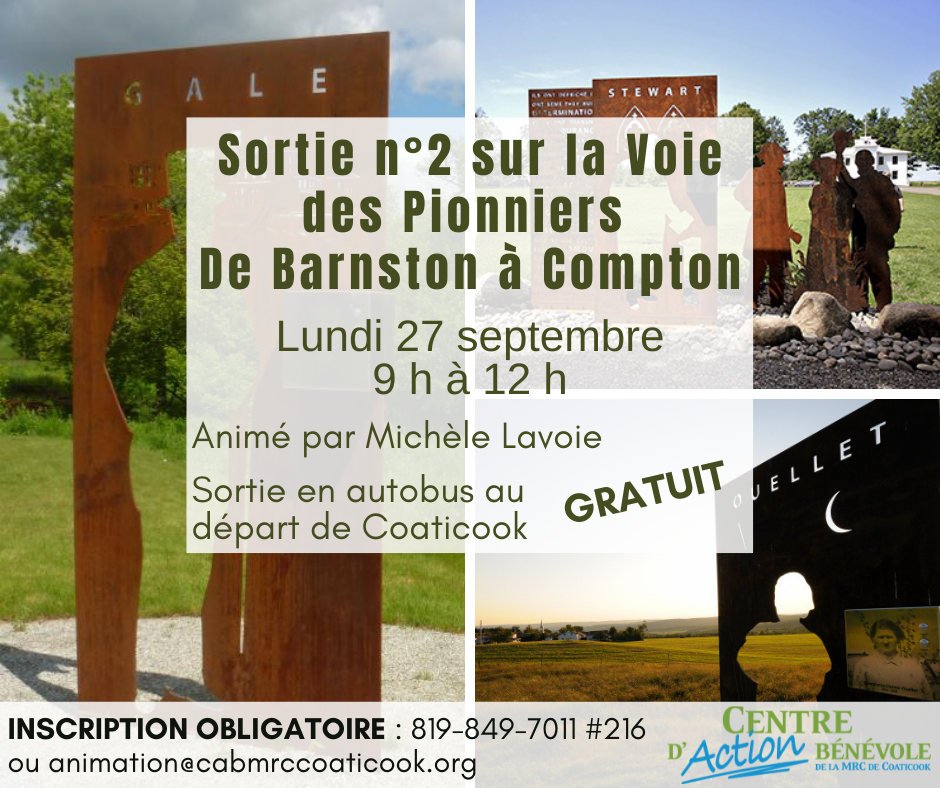Le Centre d’action bénévole vous invite à découvrir une partie de la Voie des Pionniers, celle allant de Barnston à Compton (Domaine Ives Hill), en passant par Kingscroft, Ayer’s Cliff et Hatley.