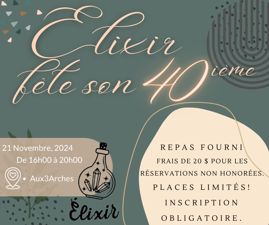 L’organisme Élixir souligne son 40e anniversaire lors d’une soirée qui se déroulera le jeudi 21 novembre dès 16h à la salle « Aux 3 Arches » à Sherbrooke. Cet anniversaire est l’occasion de réfléchir à notre parcours et de célébrer les impacts positifs que nous avons pu avoir dans notre communauté au fil des années. Nous accueillerons des invités et des membres de la communauté pour partager des moments mémorables, avec des bouchées et des rafraîchissements sur place.