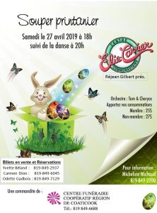 Souper chaud préparé par Luc Rodrigue suivi d’une soirée dansante avec Tom et Cheryce au Centre communautaire Élie-Carrier de Coaticook! Nombreux prix de présence