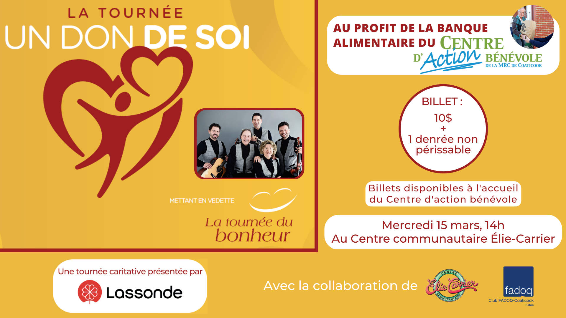 Prix spécial pour les bénévoles du Centre d’action bénévoles de la MRC de Coaticook ainsi que les membres de la FADOQ Coaticook : 5 $ et une denrée.