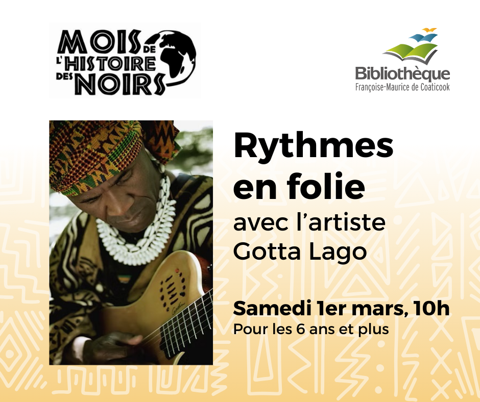 Pour célébrer le Mois de l’histoire des Noirs, la Bibliothèque Françoise-Maurice de Coaticook reçoit l’artiste Gotta Lago le samedi 1er mars à 10h.