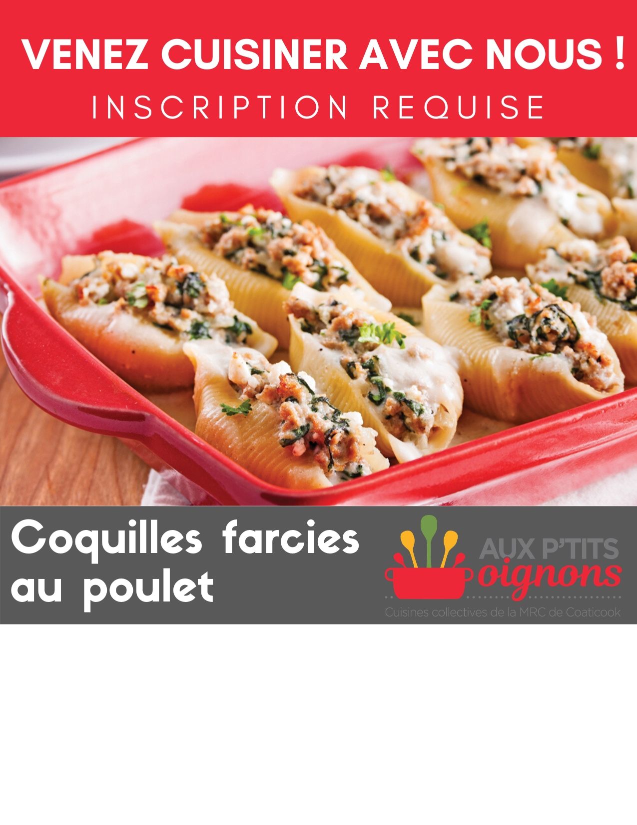 Le jeudi 23 janvier, les coquilles farcies au poulet sont à l’honneur! C’est parfait pour réchauffer votre cœur en ce mois de janvier. N’oubliez-pas vos contenants de transport.