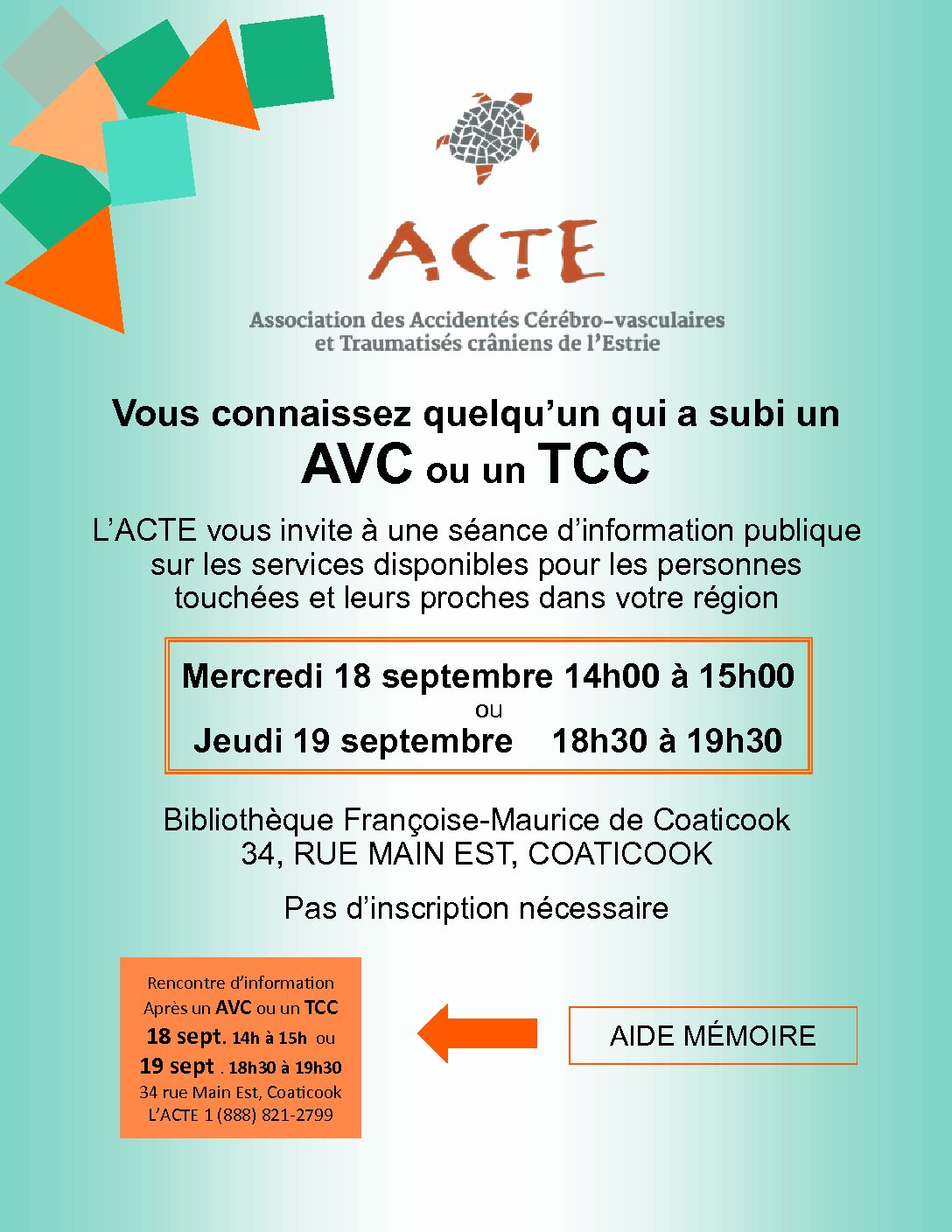 L’ACTE (Association des Accidentés cérébro-vasculaires et Traumatisés crâniens de l’Estrie) vous invite à une séance d’information publique sur les services disponibles pour les personnes touchées et leurs proches dans la région.