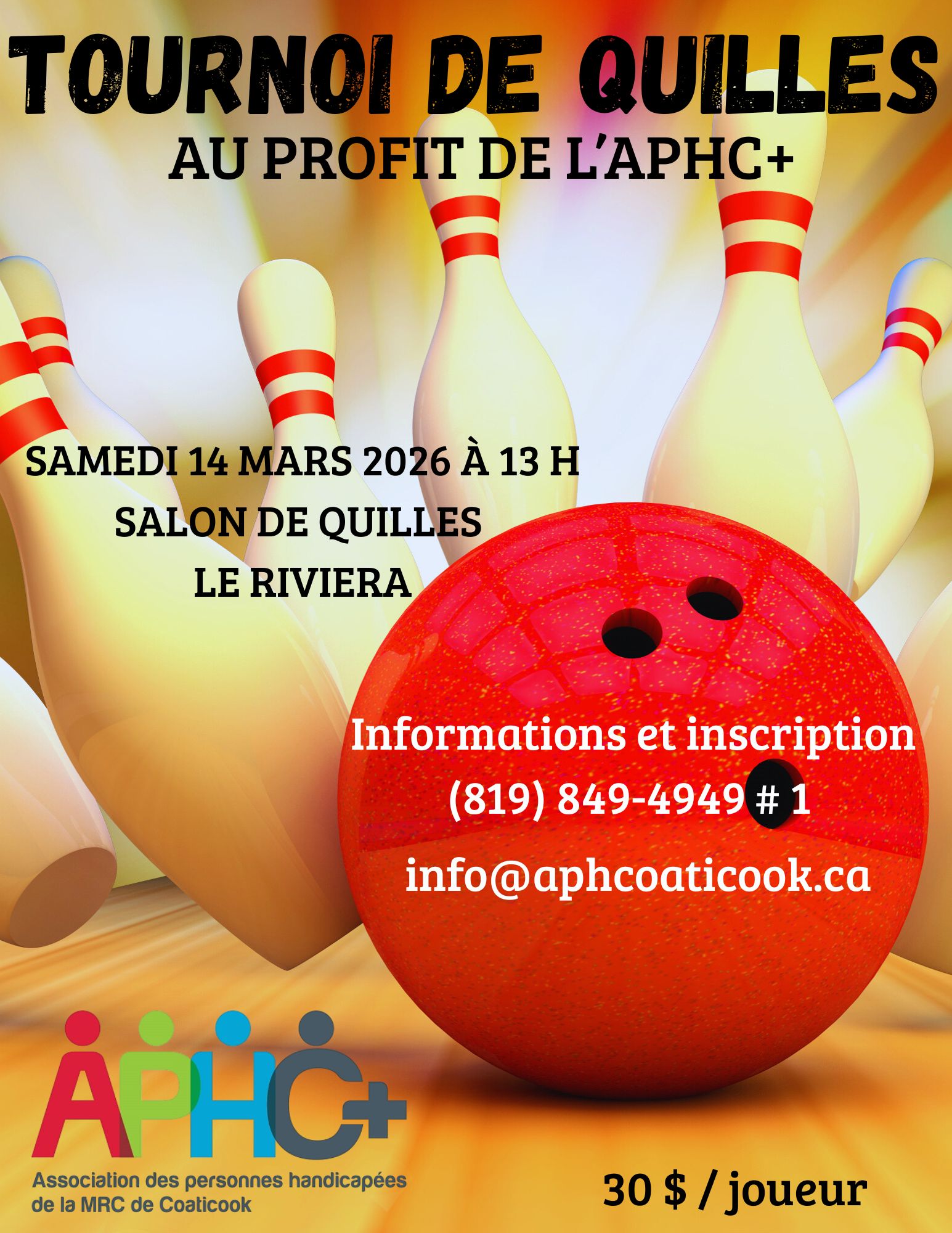 Tournoi de quilles amicale au profit de l'Association des personnes handicapées de la MRC de Coaticook. Équipes de 5, 10 allées. Inscriptions à l'avance. Pour informations et inscriptions téléphonez à L'APHC+ 819-849-4949 #1 30$/personne