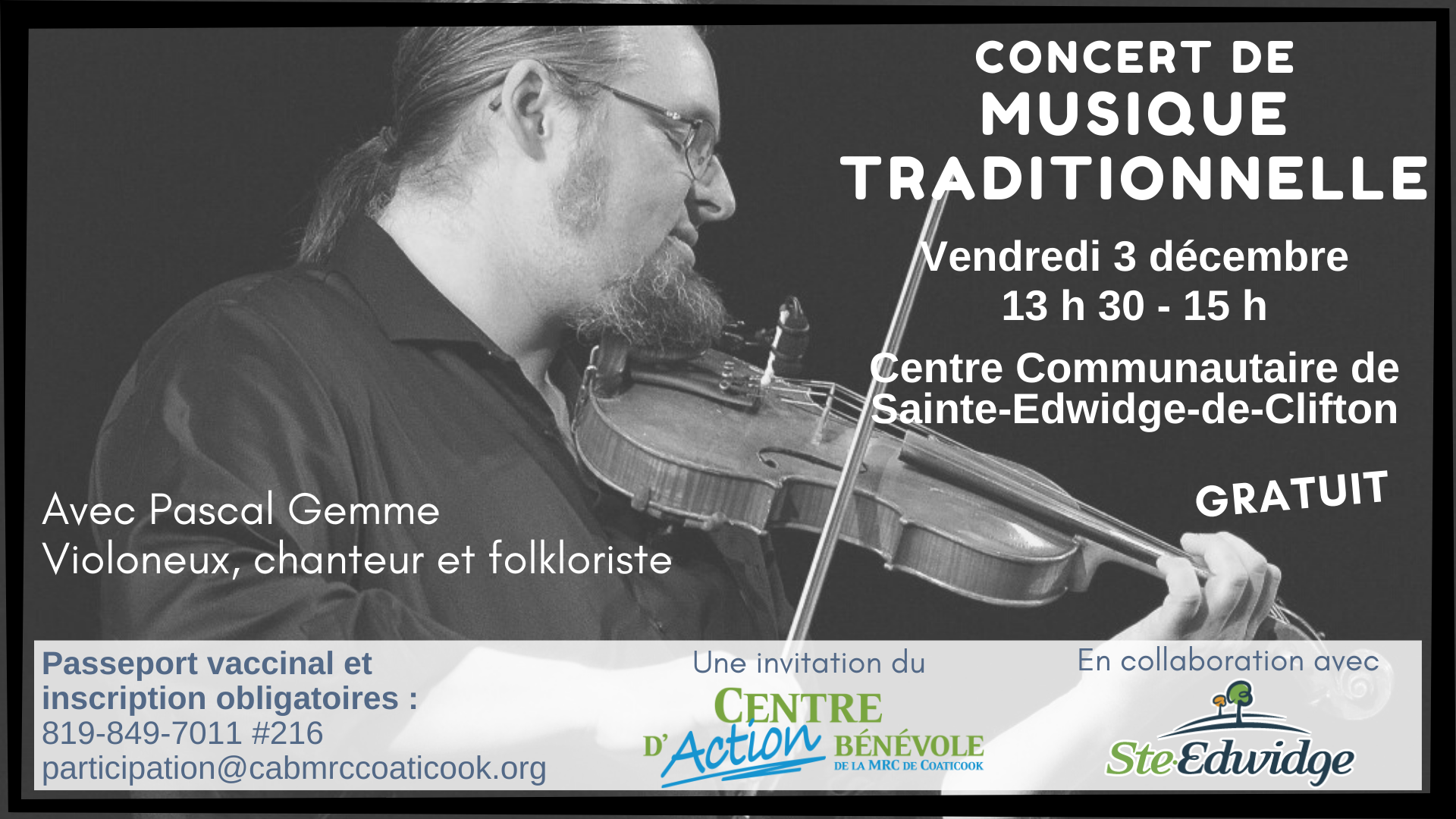 Le Centre d'action bénévole et la municipalité de Sainte-Edwidge vous invitent à assister gratuitement à un concert de musique traditionnelle de Pascal Gemme, violoneux, chanteur et folkloriste. Passeport vaccinal et inscription obligatoires : 819-849-7011 #216 ou participation@cabmrccoaticook.org