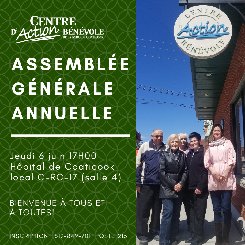Le Centre d'action bénévole vous invite à son assemblée générale annuelle qui aura lieu le mercredi 14 juin au Centre de jour de l'hôpital de Coaticook à 17 h ! Des bouchées seront servies sur [...]
