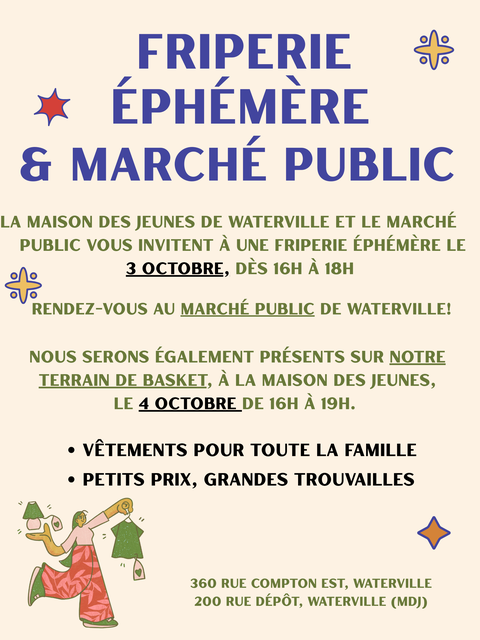 Afin de financer ses activités, la maison des jeunes de Waterville: les pacifistes, vous invite à une friperie éphémère. Elle aura lieu sur notre terrain de basketball. Venez parcourir notre inventaire, vous y trouverez vêtements [...]