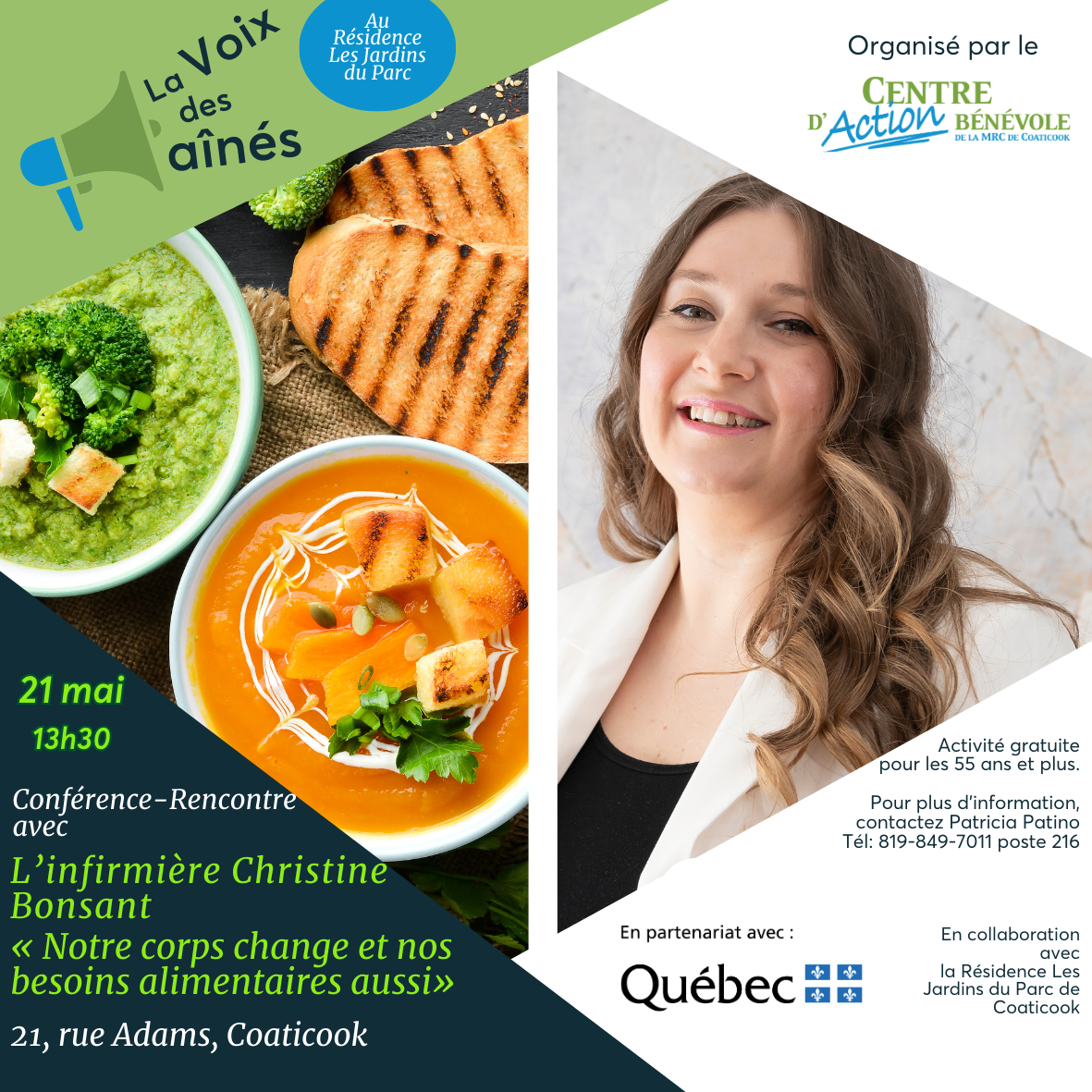 Venez rencontrer l'infirmière Christine Bonsant pour discuter des habitudes alimentaires chez les ainés, des changements à l’alimentation et des recommandations pour un vieillissement en bonne santé. Conférence gratuite ! Vous pouvez participer à l’activité même [...]