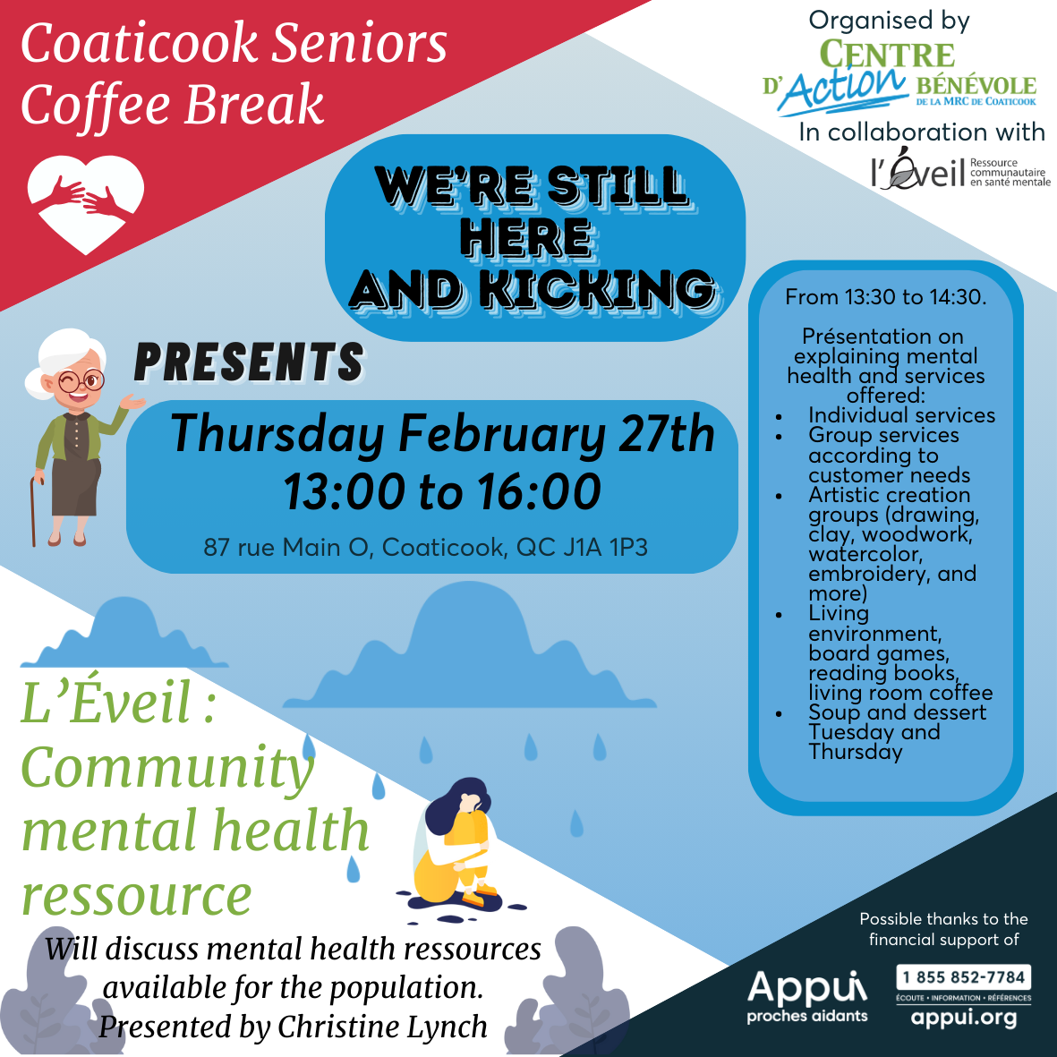 Thursday February 27th we will be welcoming Christine Lynch, mental health counselor for L'Éveil. L'Éveil is a community mental health resource in Coaticook that hosts individual and group mental health support, as well as creative [...]