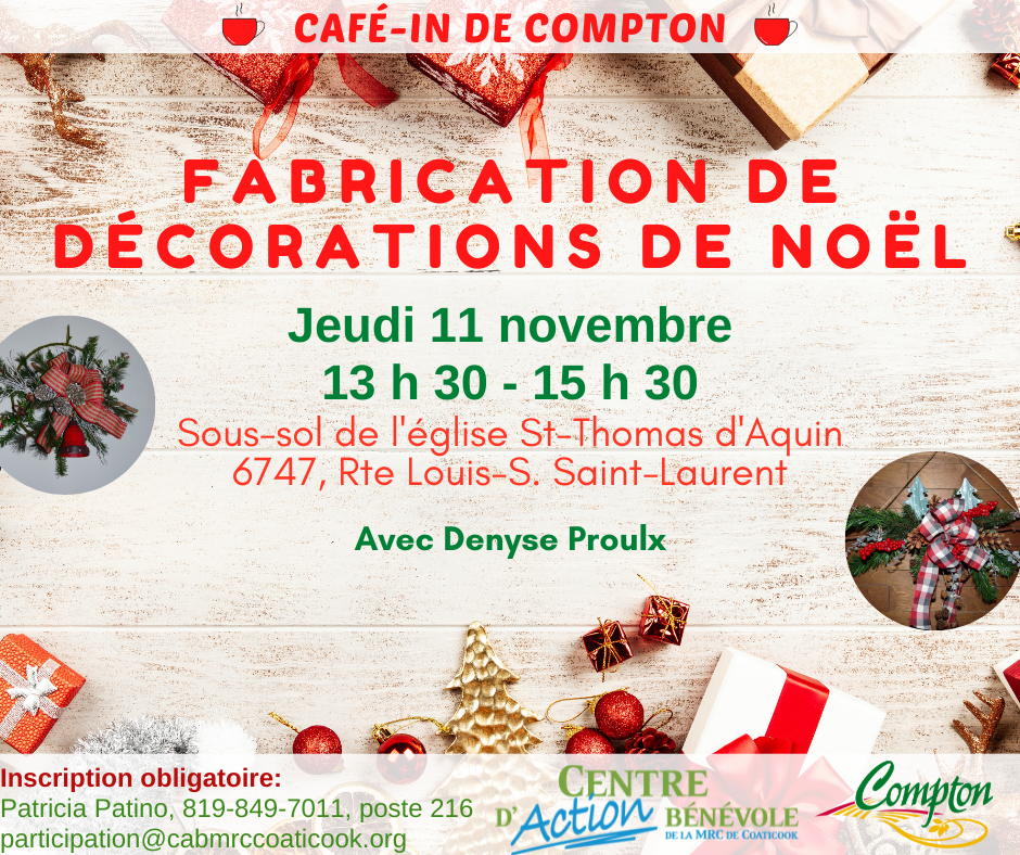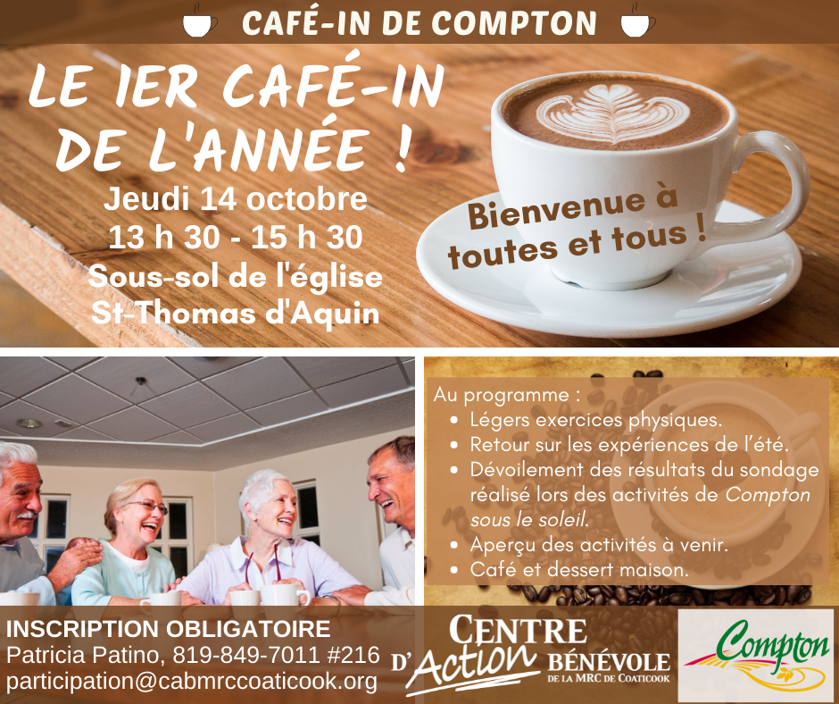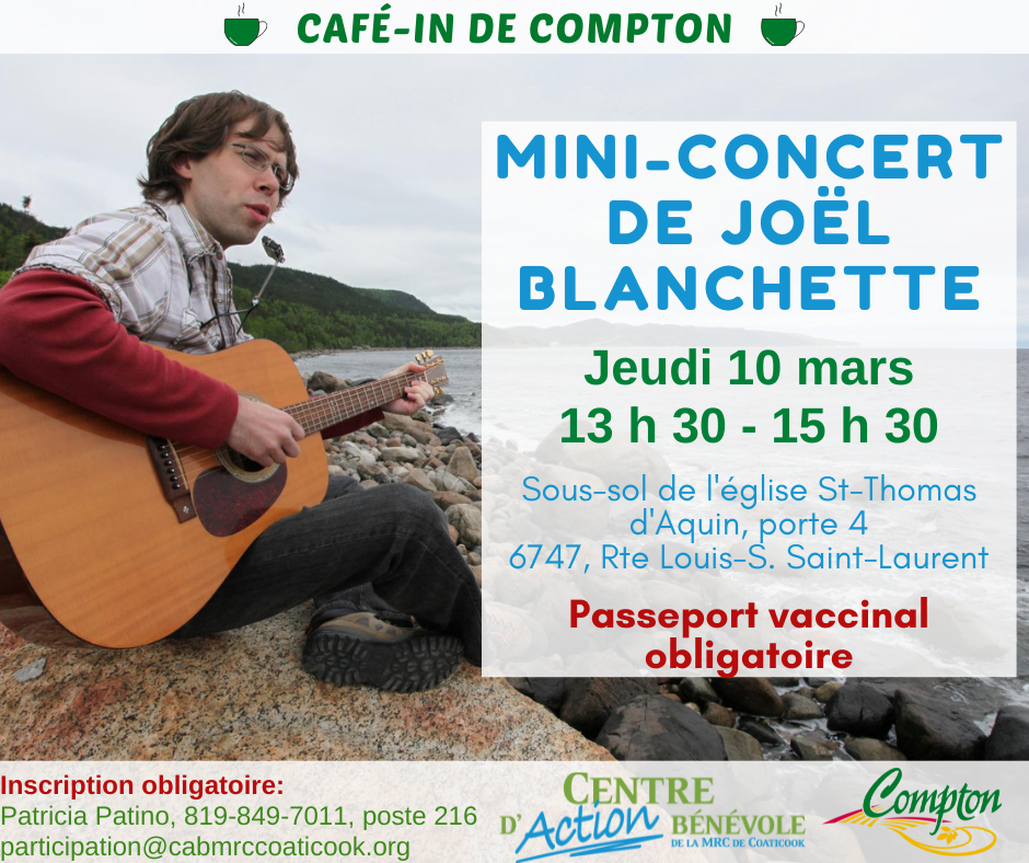 Le Café-In, la municipalité de Compton et le Centre d'action bénévole vous invitent à un mini-concert gratuit de Joël Blanchette et sa guitare. Inscription obligatoire : Patricia Patino au 819-849-7011, poste 216, ou à participation@cabmrccoaticook.org