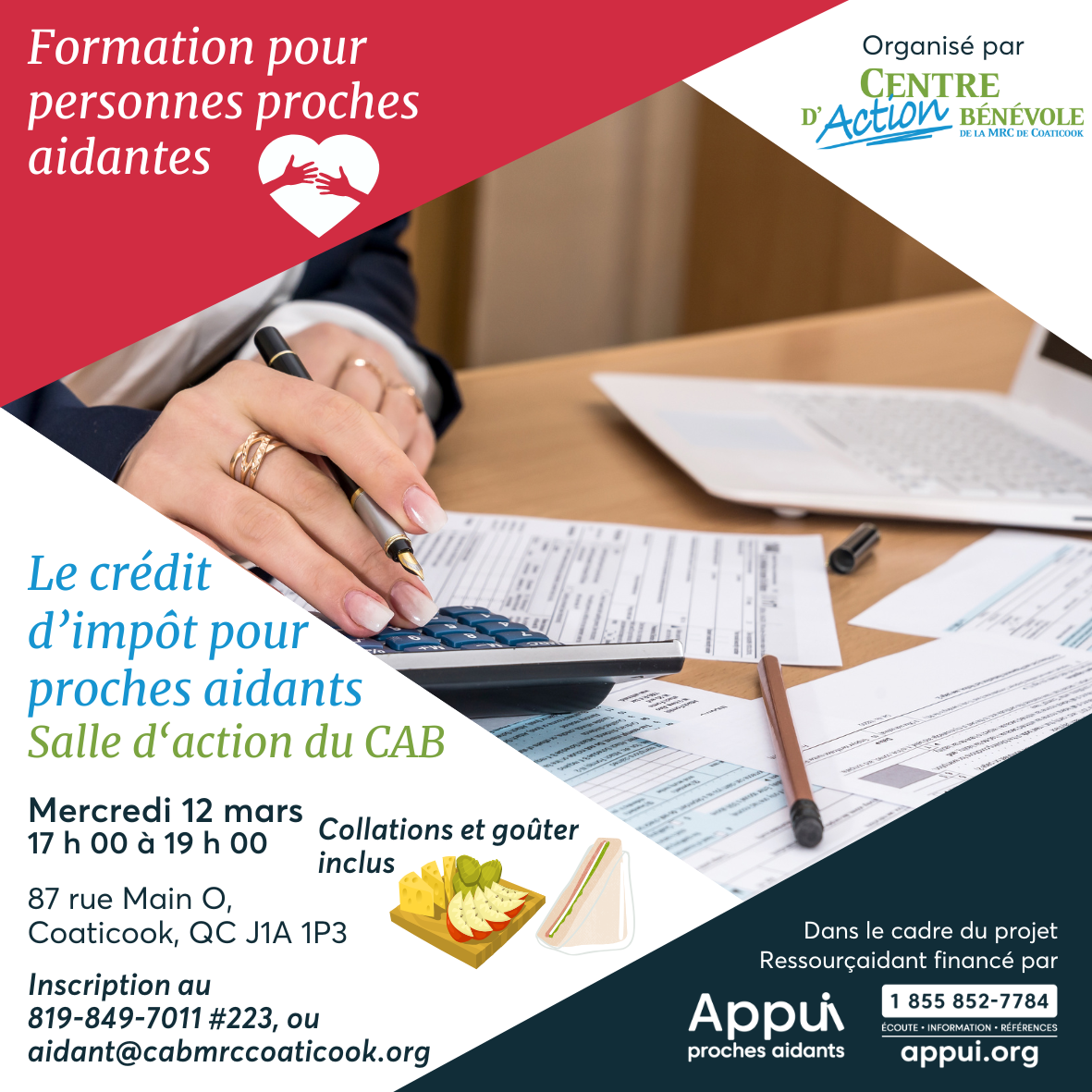 Salle Action 87 rue Main Ouest, Coaticook, Québec, CanadaLe Centre d'action bénévole de la MRC de Coaticook offre des cliniques d'impôt gratuites pour les ménages à faible revenus. De février à avril, les cliniques se déplacent dans différentes villes dans la MRC de [...]