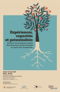 Le colloque : « Expériences, capacités et potentialités : Enrichir nos pratiques auprès des personnes aînées Sourdes ou ayant des incapacités » aura lieu à l’Université Laval (Québec), le 23 mai prochain et sera également disponible en formule webinaire (en ligne-en direct). Voici les informations sur le colloque : https://www.fourwav.es/view/1272/info/